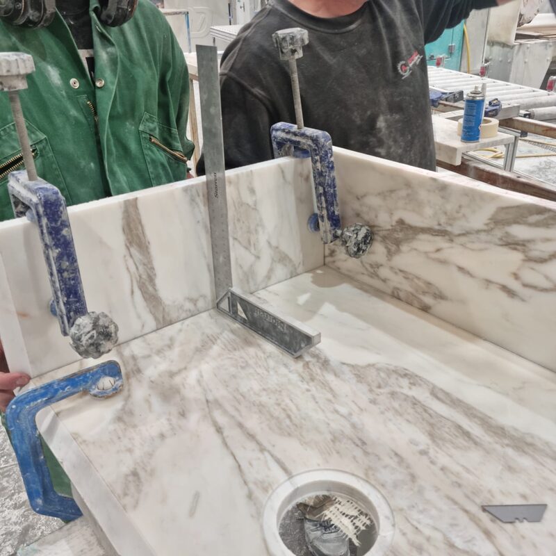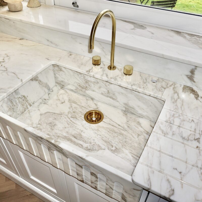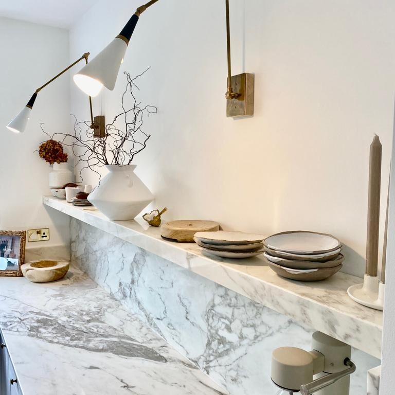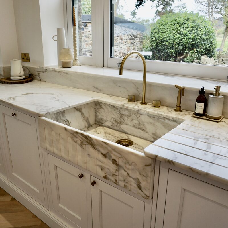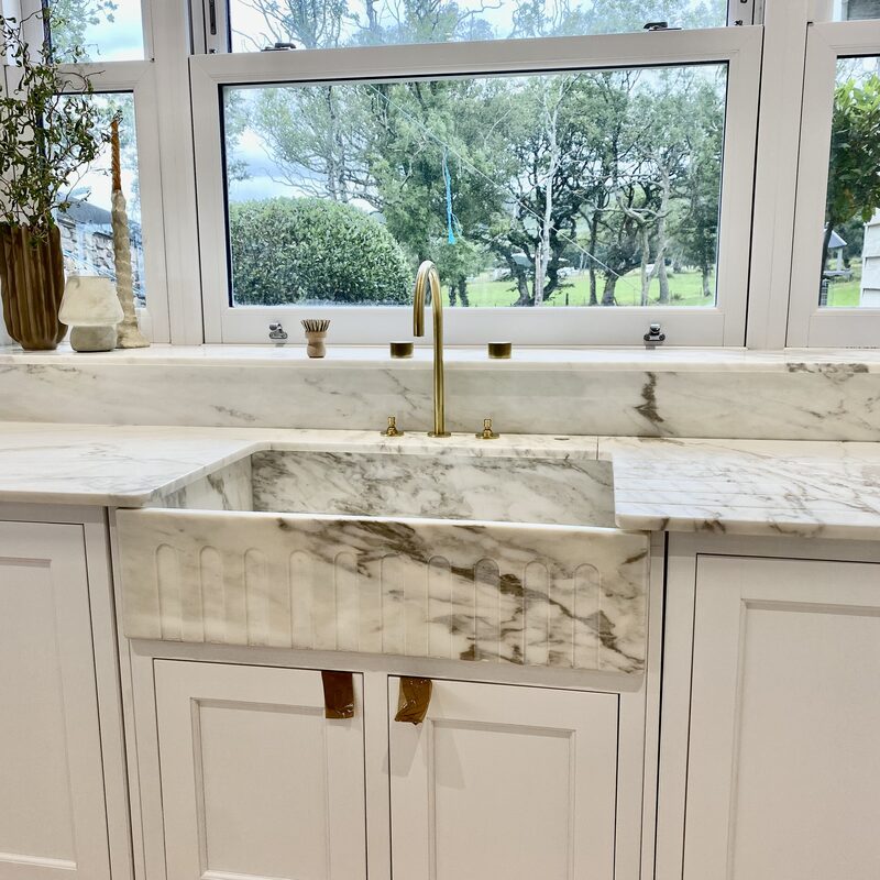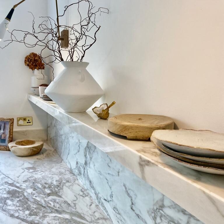 To design, manufacture and fit Calacatta Portugal marble kitchen worktops, bespoke sink and floating shelf.