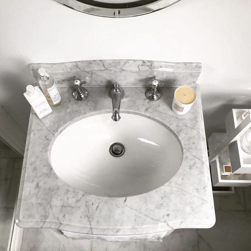 Calacatta Portugal marble worktops, bespoke sink and floating shelf.